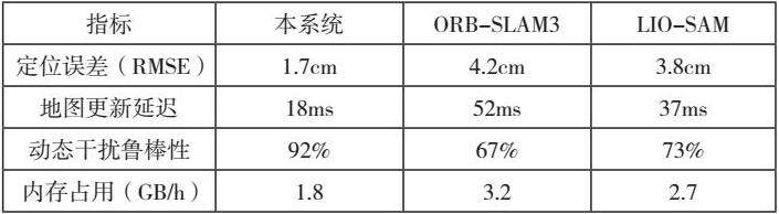 1.定位精度:强电磁干扰(30V/m)下绝对轨迹误差(ATE)为1.7cm,较ORB-SLAM3(4.2cm)提升60%