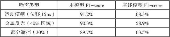(2)测试工业噪声干扰(高斯噪声σ=0.2、运动模糊像素位移=15)下的F1-score(目标≥90%)。
