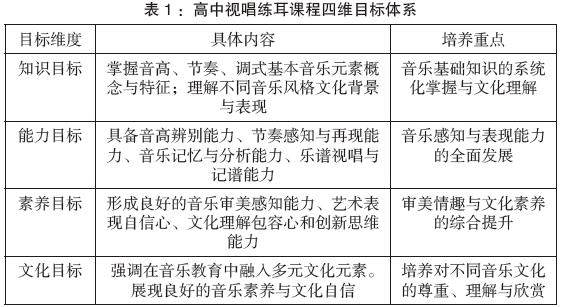 强调学生系统掌握音乐基本元素,如音的原理、记谱法、节奏节拍、调式调性等基础乐理知识,并引导学生理解不同音乐风格的文化背景。能力目标着重培养学生音乐感知与表现能力,包括音准、节奏、调式分析、音乐记忆等。素养目标旨在提升学生审美情趣与文化素养,通过视唱练耳和音乐文化体验增强鉴赏力和艺术表现力。文化目标是培养学生尊重、理解与欣赏不同音乐文化,通过课程培养开放包容的文化心态,展现音乐素养与自信,推动音乐文化的交流融合,促进音乐艺术繁荣。