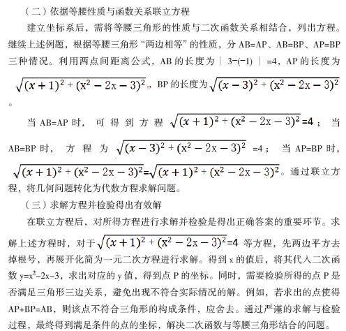 在联立方程后,对所得方程进行求解并检验是得出正确答案的重要环节。求解上述方程时,对于等方程,先两边平方去掉根号,再展开化简为一元二次方程进行求解。得到x的值后,将其代入二次函数y=x2-2x-3,求出对应的y值,得到点P的坐标。同时,需要检验所得的点P是否满足三角形三边关系,避免出现不符合实际情况的解。例如,若求出的点使得AP+BP=AB,则该点不符合三角形的构成条件,应舍去。通过严谨的求解与检验过程,最终得到满足条件的点的坐标,解决二次函数与等腰三角形结合的问题。