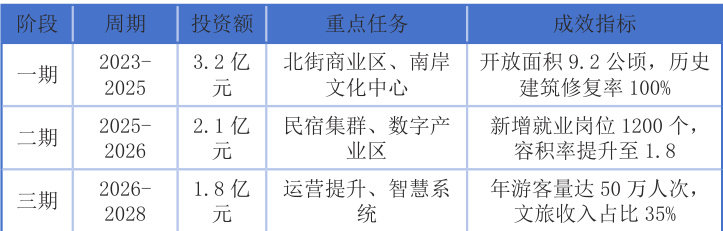 30% 以上,为财力有限的中小城市提供可复制经验。机制创新层面,构建”文旅运营 + 社区参与 + 数字赋能”的可持续模式,预计项目全面建成后年接待游客 50 万人次,创造就业岗位