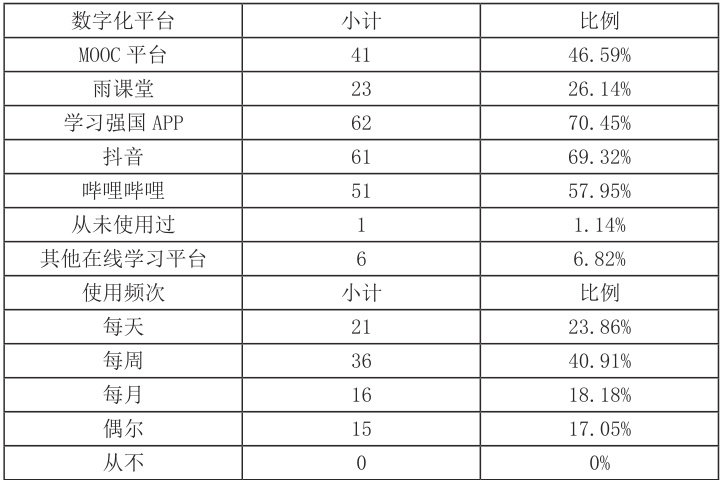 学生广泛使用各类数字化技术,其中学习强国 APP 和抖音因内容丰富、形式多样、传播广泛,使用率达70% 左右,符合学生碎片化学习习惯;哔哩哔哩以优质课程和弹幕互动受青睐,使用率达58% ;MOOC平台因系统完整课程便于自主学习,使用率为47% ;雨课堂虽使用率较低,但在辅助课堂教学方面各平台都各具独特优势。学生使用数字化技术学习的频率上,2/5 的同学每周使用,近 1/5 的同学每天使用,每月和偶尔使用的共占比 2/5。这表明数字化学习已成为学生日常学习的重要方式,但部分学生因个人学习计划、技术设备条件等影响,使用频率较低。因此,高校应加强数字化学习资源的推广宣传,引导学生合理规划学习时间,充分利用数字化技术,并关注使用频率低的学生群体,了解原因后给予支持帮助。