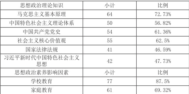 学生对马克思主义基本原理的掌握程度较高,这得益于高校将其作为重要的思想政治理论课程,教学内容系统全面且方法不断创新。而对中国特色社会主义理论体系、中国共产党党史、社会主义核心价值观的熟悉程度也都能到达平均水平,但整体还有上升空间,相关教学和宣传有提升空间。此外,学生对国家法律法规和习近平新时代中国特色社会主义思想的熟悉程度相对较弱,这方面内容需加强这些内容的普及和讲解。在影响学生思想政治素养的因素中,学校教育、社会环境及家庭教育是影响学生思想政治素养的主要因素,分别作为理论传授、价值观引导和品德形成的基础。媒体影响和个人兴趣爱好也占有一定比例,说明外部信息和个人内在动力的重要性。因此,高校应优化思想政治理论课程体系,采用多样化的教学方法,并加强与家庭、社会的合作与沟通,形成协同育人局面,同时利用媒体传播正能量,引导学生树立正确价值观。