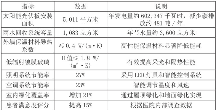 涡阳县人民医院改扩建项目在建筑设计方面取得了显著成效,特别是在绿色节能、智能化系统和人性境的建设上。表1 展示了一些具体的数据和效果。