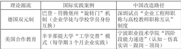 另一方面是中国实践的独特性提炼,实现了制度创新的三重突破,政策工具创新,从“土地置换”1.0 时代到“金融赋能”2.0 时代再到“数据赋能”3.0时代的演进路径。组织形态创新,市域联合体(如苏州工业园区职教集团)与行业共同体(如中国汽车工程学会产教融合委员会)的差异化定位。评价机制创新,构建“四维评价”指标(技术解决率、企业满意度、学生留岗率、成果转化率)。实践困境的理论反哺,企业需求碎片化与院校科研分散化的矛盾,催生“双清单”动态匹配理论。