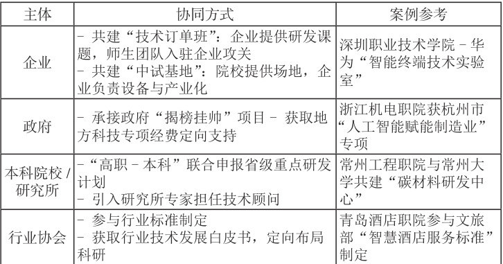 3. 多元主体深度协同。 核心是构建“政产学研用金”深度融合的创新生态。校企协同,建立校企联合实验室、技术转移中心;探索“企业出题、院校解题、市场阅卷”的合作模式;鼓励企业以资金、设备、人员、真实项目等形式深度参与。校校协同,与高水平大学、研究机构合作,借力其基础研究优势;与其他高职院校合作,形成区域职教科研联盟,共享资源,错位发展。校地/ 政协同,积极争取地方政府在政策、资金、项目、信息等方面的支持;融入地方科技园区、产业创新联合体。行(协)会协同, 借助行业协会掌握行业动态、标准制定和资源网络。