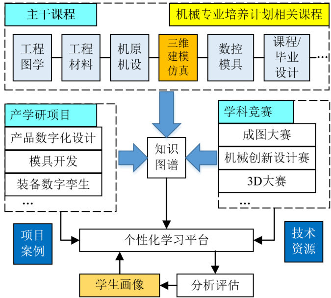 深入研究机械专业学科竞赛和产学研项目内容,将涉及三维建模与仿真的部分抽离出来,形成文本、软件资料、视频教程和训练题库等富媒体资源。如成图大赛创新设计赛道涉及快速建模装配、工作原理动画、有限元仿真和板金件计时设计,可拆解四部分富媒体资源,挂接至知识图谱的个性化学习章节;又如企业高端装备数据孪生项目,使用建模软件完成关键部件绘制装配,再以STL 格式导入 Blender 进行渲染和 GLTF分离式导出,利用开源或低代码 web3D平台进行数据绑定,实现实时数据挂接。学生通过知识图谱及其挂接资源,更好理解三维建模课程的学习意义和目标,并通过多种技术链学习得到实战能力提升。