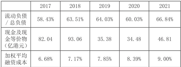 在 2017 至 2021 年,华南城的资产负债率维持在 65% 左右,与行业平均水平接近,但债务结构持续恶化:流动负债占比从 58.43% 升至 66.84% ,而现金储备从 82.04 亿港元锐减至 46.81 亿港元。为缓解流动性压力,2018 年后公司被迫以超 10% 的高息发债融资,2021 年加权平均融资成本达 9% 。同时,其流动负债高达 530.06 亿港元,其中一年内到期短期借款达 207.5 亿港元,现金覆盖率仅 22.6% ,偿债能力严重不足。加上疫情冲击及 2022-2023 年集中到期的多笔美元债券,公司陷入“借新还旧”的困境。引入国有资本优化债务结构,成为缓解短期偿债风险的关键路径。