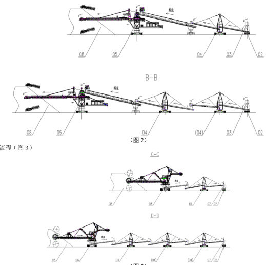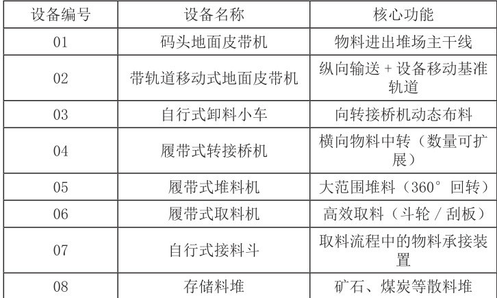 2.2 堆料工艺流程(附图 2)物料流:01 码头皮带机 → 02 移动式地面皮带机 → 03 自行式卸料小车 → 04 履带式转接桥机(×N) → 05 履带式堆料机 → 08 料堆关键技术协同:·卸料小车03 沿02 轨道移动定位·转接桥机04 数量N 根据料堆宽度动态配置(N= 堆宽/ 单机覆盖宽度)·设备组(03+04+05)沿 02 同步行走,行走偏差 <50mm