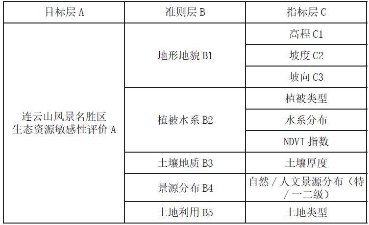 基于风景名胜区中生态资源的自身重要性以及其对生态系统服务的影响,本文参考了张德顺 [2] 以及樊佳敏等 [24] 前人研究,选取了地形地貌、植被水系、土壤地质、景源分布、土地利用作为准则层,并在此基础上选取 9 个指标层作为风景名胜区生态资源敏感性评价的单因子。以敏感程度作为赋值分级,将指标分为“不敏感、轻敏感、中敏感、高敏感、极敏感“五级,并对应值域1,3,5,7,9。