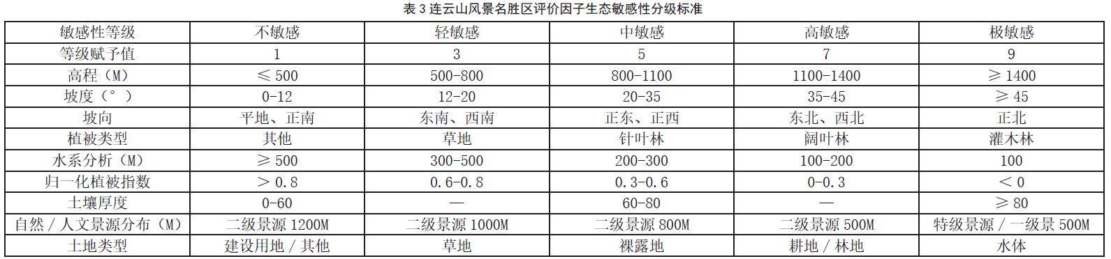 生态敏感性指标评价体系是对指标层的分级标准及权重的进一步综述,而指标属性的赋值等级及权重又将极大的影响最终的成果。考虑到实际应用情况,具体的分级标准没有明确的条文规范限制 [25]。如涉及地貌特征因素,王国玉 [1] 等认为高程因子敏感性的选取应考虑风景名胜区所处地貌特征并结合景观性及游赏需求;李抒音 [26] 等在青龙山风景区研究中发现坡度较大区域越容易造成水土流水,并因此以(0、5、15、30°)值域范围来划分敏感区域;而对于坡向敏感因子,部分研究 [27-28] 显示在我国大部分区域,植物丰富指数在阴坡区域明显优于阳坡,故在坡向选取时大部分以正北方向为敏感区域,南向为不敏感区域。