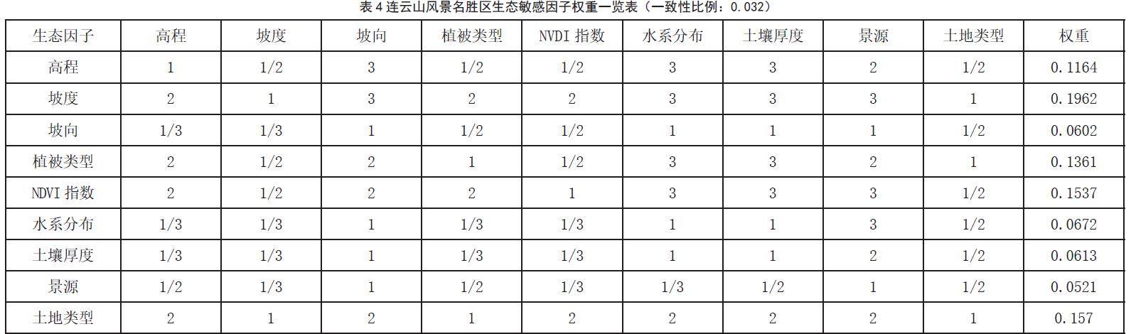 AHP (Analytic Hierarchy Process) 层次分析法是一种求解多个因素与其关联的多个目标因素的权重的方法 [19]。其主要通过构建矩阵模型,以上一层的A 要素为评价准则对下一层的B要素进行两两比较从而确定矩阵的元素值。本文通过层次分析法得出各生态敏感因子之间的权重,最后进行各要素叠加运算得到综合生态敏感分析。