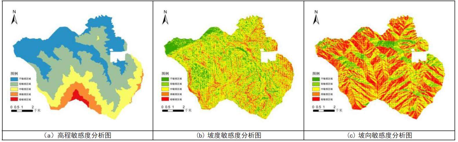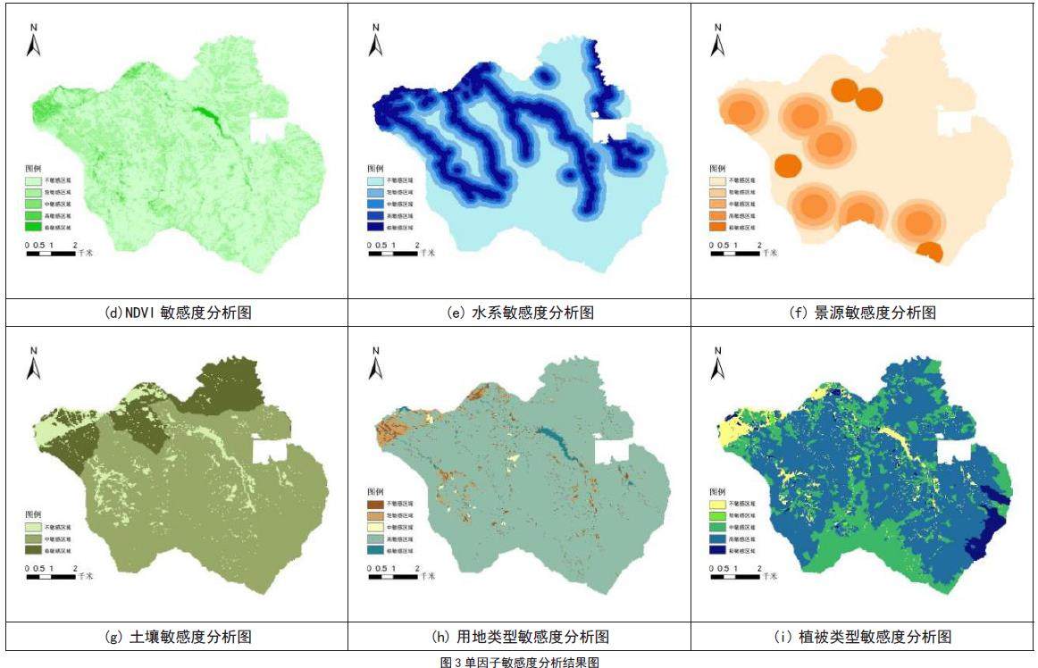 根据各敏感因子划分标准得到相对应的单一生态敏感度分析图,不难发现高程及坡度因子以南部山体区域为最敏感区域,而坡向因子则依托于山脊线走向呈现敏感度分布;水域及土壤敏感度以北侧区域为主要敏感区域,景源敏感因子则是以南侧山体区域以及西侧为主要敏感区域;植被与NDVI 由于区内大部分以林地为主,故分布情况没有明显的空间积聚效应。