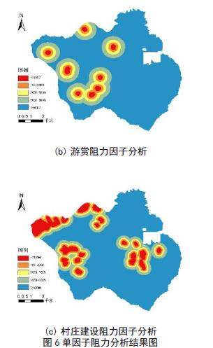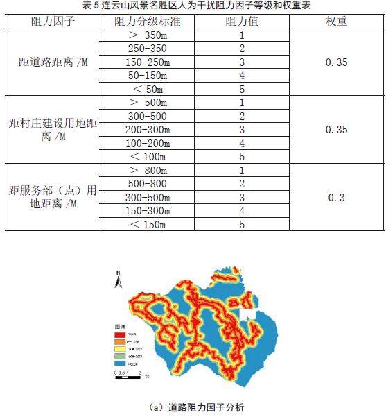 科学的选取阻力面能够比较正确的研判外界因素对于生态源地的影响范围 [33]。本文基于人类活动干扰程度进行阻力面因子构建,其中包括道路阻力因子、村庄建设阻力因子以及游赏阻力因子。通过 ArcGIS 对各阻力因子进行分级并且参考前人研究 [33-34] 进行阻力系数确定(统一阻力值范围为1-5)[34],最终得到综合阻力面。