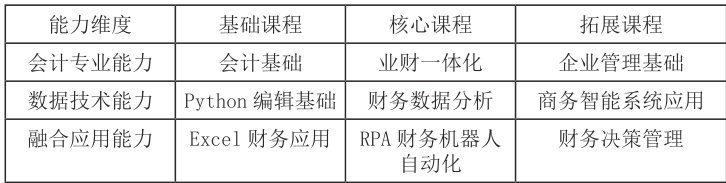近几年大数据与会计专业课程设置存在“三段式”割裂,公共基础课、专业核心课、专业拓展课之间缺乏有机衔接,大数据类课程与会计类课程“并轨不并融”,学生难以形成业财融合整体思维。如《财务大数据分析》课程前置要求具备会计专业知识和 Python 编程能力,但实际教学中两类课程平行开设,导致学生难以完成跨学科学习。