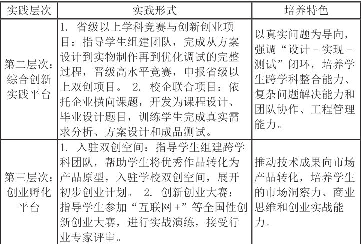 实践是检验和提升创新能力的最终环节。一个完善的实践平台体系,是连接“理论课堂”与“产业战场”的桥梁 。本模式构建了一个系统化、递进式的“三层次”实践教学体系 ,覆盖了学生从基础技能训练到创业孵化的全周期。这一分层递进的理念,与职业教育中从“启蒙期”到“实践期”的四阶段培养模式具有内在的一致性 ,体现了其教育规律的普适性。