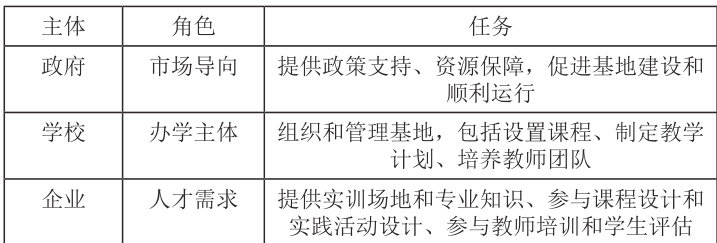 动画专业在 OBE 理念引领下,应以学生就业为目标导向建设产教融合实践教学基地,使得培养出来的学生更加满足企业需求。与此同时,构建一个多方互动的基地建设模式(见表 1),推动政府、学校、企业之间的紧密合作,实现深度产教融合。此外,在基地建设中应以产业链发展为依托适时超前,通过将产业链上游和下游的企业资源进行整合构建综合性实训基地,为学生提供丰富、多样的实践内容,并开展产学研项目,由教师带领学生参与或主导人工智能动画项目,通过运用AI 技术提高学生实践能力。