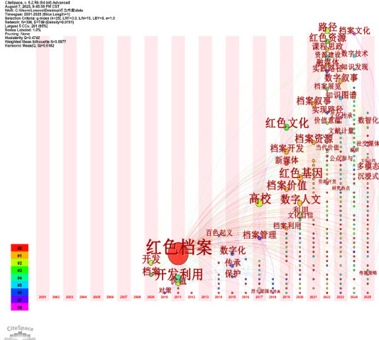 结合图 1 年度发文量趋势图和图 2 关键词时区图可以看出,2000 年以前,“红色档案”主题的研究文章非常少,且多数为新闻宣传类文章。进入 2000 年以后,红色档案概念逐步被关注,并展开关于红色档案概念、理论基础、开发利用等多方位的研究。根据图表情况,可以将这个过程可分为3 个阶段,大致每10 年呈现出一个新的发展阶段。2000 年-2010 年,此时对红色档案的研究处于初步探索阶段,研究文章年发文量低于 7 篇。2011 年 -2018 年,该领域受到一定的关注,年发文量有所增长 , 每年发文 12-17 篇。2019 年 -2025 年,研究文献数量呈井喷式增长,2019 年发文量猛增至 63 篇,2021 年突破到 299 篇,2025 年知网预测将达到576 篇。