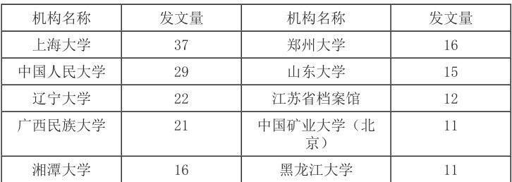 利用 EXCEL 透视表对 1129 篇文献发文机构梳理进行统计(如表 1 所示),总发文机构共695 家,其中大学约400 家,各地档案馆(局)256 家,其余为政府机构、企事业单位。据统计,发文量前 10 的机构发文总数为 190 篇,即 1.44% 的机构发表了 16.83% 的文章。其中上海大学发表37 篇,数量居榜首;发文数在20-30 篇的有中国人民大学(29 篇)、辽宁大学(22 篇)、广西民族大学(21 篇);发文数在 11-20 篇的有湘潭大学、郑州大学、山东大学、江苏省档案馆、中国矿业大学(北京)、黑龙江大学。