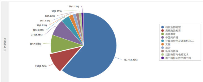 通过知网发文量前 10 的学科分布可视化分析图(图 4),可以看出,档案及博物馆作为红色档案的本体学科,发文量占比为61.43%,是研究的主体;思想政治教育、高等教育、中国共产党党史分别占比 25.3%、9.00%、8.81%,反映出红色档案文化价值、教育价值、资政价值在各学科领域的拓展与升华;计算机软件及计算机学科发文有 105 篇,占比 4.09%,代表着新兴技术与红色档案资源开发相结合的探索具有一定的规模。其次,文化、旅游、新闻与传媒、戏剧电影与电视艺术、图书情报与数字图书馆等学科虽然占比低于 2%,但发文量也有29-52 篇,体现了红色档案与社会文化、经济、生活等方面很强的结合点。