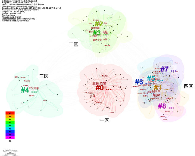 关键词共现聚类图谱(图 5)展示的是研究文献中关键词聚类情况和各聚类之间的交叉融合关系,关键词聚类时间线图(图 6)从时间、聚类二维角度展示红色档案研究的阶段性发展情况和研究热点变化情况。根据知识图谱情况,可将关键词聚类分布图分为 4 个区,这4 个区分别代表国内档案学界对红色档案的研究方向。