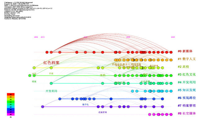 将 1129 篇文献导入 CiteSpace 软件,生成关键词共现聚类知识图谱(图 5)和关键词时间线图谱(图6)。软件共生成新媒体、数字人文、高校、红色文化、开发利用、知识发展、实现路径、档案管理、社交媒体 9 个聚类。当聚类模块值 Q>0.3 时,表示聚类结构显著,聚类平均轮廓值 S>0.7 时表示聚类合理 , 本研究 Q=0 .472, ΔS=0 .8919,关键词聚类满足条件,因此聚类具备一定可信度。