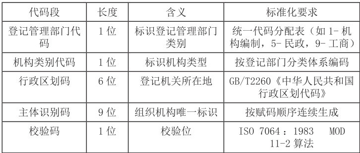 GB 32100-2015《法人和其他组织统一社会信用代码编码规则》作为强制性国家标准,是统一社会信用代码制度的核心技术支撑。标准规定统一社会信用代码由18位字符组成,包含五个关键部分:登记管理部门代码(1位)、机构类别代码(1位)、登记管理机关行政区划码(6位)、主体标识码(9位)和校验码(1位)。这种结构化设计既确保了代码的唯一性和稳定性,又保留了必要的分类信息和区域属性。[3]