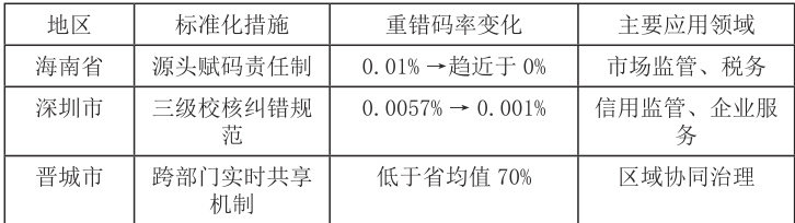 标准化校核机制为识别和纠正历史遗留问题的重错码问题提供了系统性解决方案。深圳市针对长期存在的重错码难题(2023年初重错码率达0.0057%),组织市信用办、企业注册局、公共信用中心成立专项工作组,通过建立重错码成因分析模型、开发智能校核工具、制定数据纠错操作指南,采取“事前校验、事中提醒、事后追溯”三级校核的标准化质量管控体系,三个月后,重错码率大幅下降至0.001%,在全国重点城市排名跃升至前列。[8]