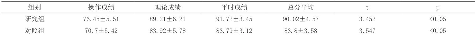 从表1 可见,研究组(PBL 教学组)在操作技能(76.45 分)、理论考核(89.21 分)、平时表现(91.72 分)及总分(90.02 分)上均显著高于对照组(传统教学组),其中平时成绩差距最大(研究组 91.72 分与对照组83.79 分相比,提升 9.46%),操作技能与总分亦分别提升 8.4% 与 7.4%。这表明 PBL 通过项目任务驱动、团队协作与过程性评价,有效强化了学生的实践能力、自主学习意识及综合素养。