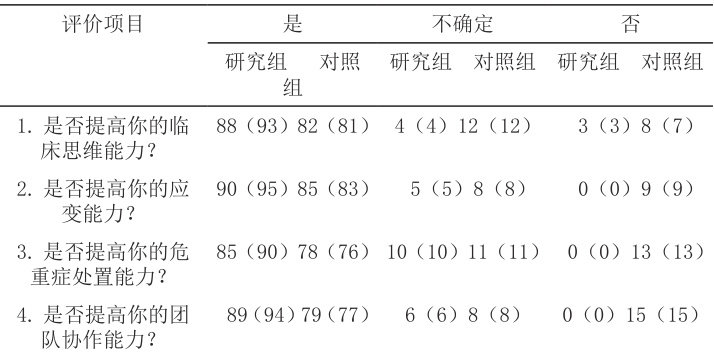 3.2.1 学生自我能力评价 实践能力评估从各个小组对案例的演练情况来看,研究组学生整体的护理操作能力比对照组高,对患者的紧急处置以及抢救能力比对照组好,在抢救过程中成员可以更好的配合。学生掌握急救核心技能后能更快适应临床工作。
