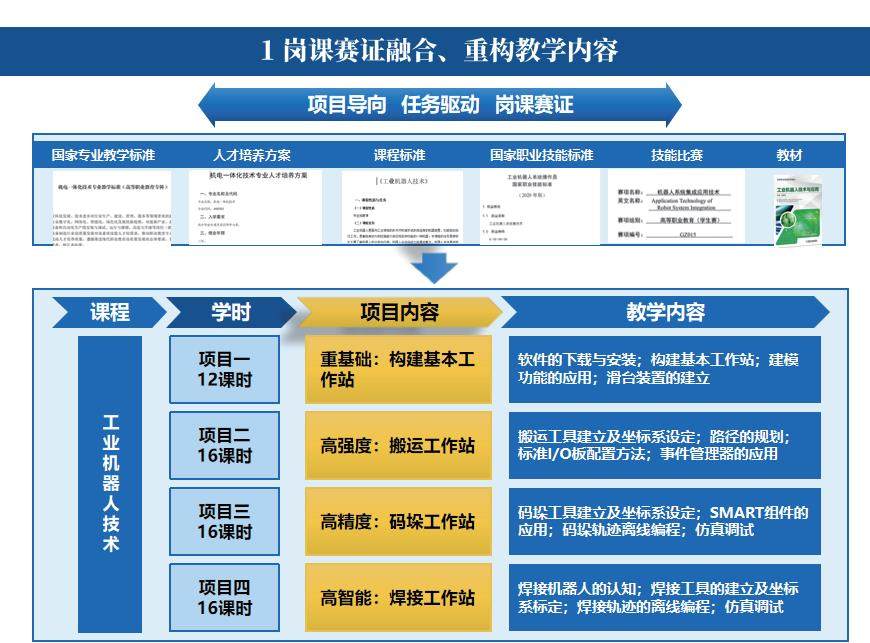 《工业机器人技术》课程开设于第三学期。课程融合工业机器系统操作员岗位需求重构教学内容,凝练工业机器人生产、应用技术岗位核心职业素养深挖思政元素。深入融合岗位职业素养要求进行了工业机器人技术课程内容重构。