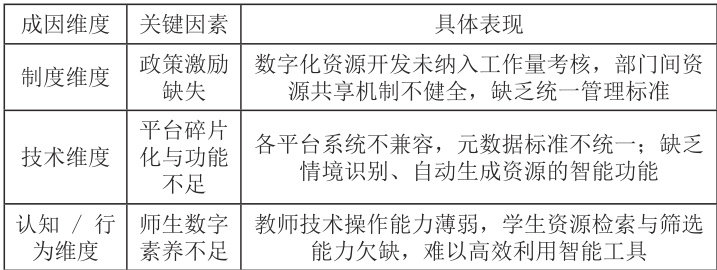 从教师维度看,Zhao 等 [8] 调研发现,80% 以上的高校教师在数字化资源开发中面临“技术能力不足”“平台操作繁琐”“工作量不被认可”三重困境,且资源与教学目标的适配性需依赖教师手动调整,进一步加剧工作负荷;从学生维度看,Martinez 等 [9] 对开放教育资源(OER)的使用现状研究表明,学生难以通过现有平台获取符合自身认知水平与学习进度的资源,且资源内容与课堂实时讨论、问题解决需求脱节,导致学习迁移效果不佳。
