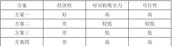 基于不增加司机成本、不降低企业收入原则,从经济性、司机吸引力和可行性三方面比选(表 5)。方案一增收 1360 万元 / 年,吸引力与可行性均高;方案二经济性与可行性低;方案三虽经济性好但吸引力与可行性低;方案四吸引力高但企业年损 345 万元。故推荐方案一。