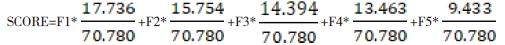 将样本数据代入下述线性方程可算出各企业因子分数,并经过旋转的各因子方差贡献率与相应因子分值相乘,可得各企业综合分数表现企业综合内部控制相关指标水平,由此评估各企业内部控制状况。