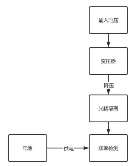 设计的系统总体框架主要包括电池供电单元、变压器、光耦隔离及频率监测电路,如图所示。