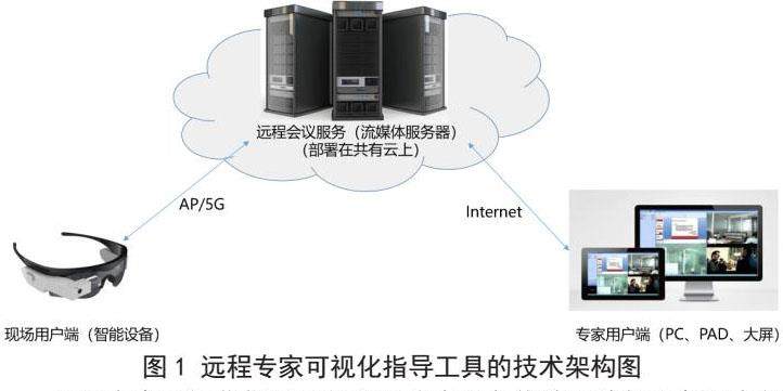 远程专家可视化指导工具主要分为设备终端和功能服务两大部分,其中,设备终端分为两大类,一类是现场用户端,主要由智能设备构成,完成现场用户的数据采集、音视频传输等工作;一类是专家用户端,主要由专家端软件系统构成,根据专家用户的具体使用场景可以安装在PC、PAD或大屏上。功能服务,由流媒体服务器组成,部署在公有云上,对外提供远程会议的服务。