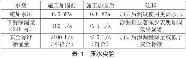 通常在大坝加固后进行压水实验,在执行实验时,务必准确测定所施加的水压强度、水压作用时长以及下游泄漏位置的水流速率。剖析这些资料,便能审视大坝防渗加固的成果。在加固工程启动前,大坝结构性缺陷如裂缝和孔隙已导致严重渗漏。某水库大坝在加固之前,进行压水实验,结果显示,在0.5MPa水压作用下,24小时之内,下游渗漏量达到100升/秒,显然已经违背了安全规范。该调查结果暴露出这座大坝存在严重的防渗漏缺陷,亟待采取有效的加强措施。完成高压旋喷和帷幕联合灌浆的防渗加固后,需再次开展压水实验,以即时验证加固效果。若加固措施得以奏效,0.8MPa的水压下,24小时内,下游的渗漏量有望大幅减少,或许降至每秒5升以下,甚至达到零渗漏的最佳效果。这一明显的好转说明,经过加固的大坝成功构建了有效的防渗隔离层,大幅提高了大坝的稳固性。详情见表1。
