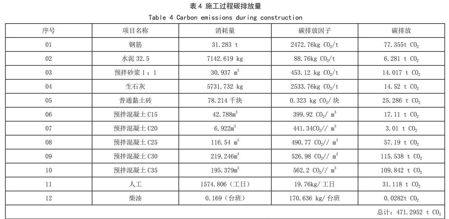 考虑到施工现场周围环境和运载距离等因素,根据表2不同施工机械的CO2排放量的能耗量和碳排放因子,本建筑工程材料的能耗按自卸汽车计算。然后应用文献所推算的碳排放因子,通过公式(1)和公式(2)换算后,得到项目参数的碳排放量见表4。