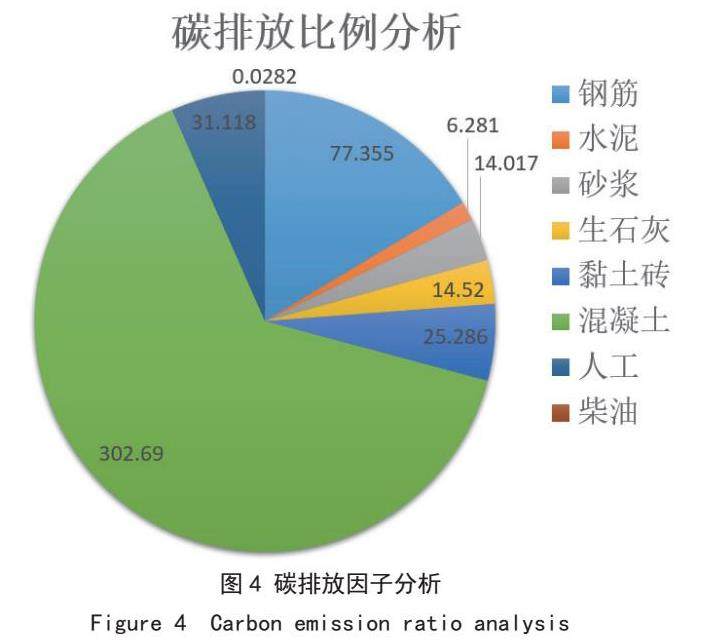 建筑施工阶段的碳排放计算模型包括:建材碳排放因子、化石碳排放因子及能源电力碳排放因子等参数,根据上述模型参数的计算,可推得施工过程中碳排放最大的是混凝土浇筑工程,见图4。