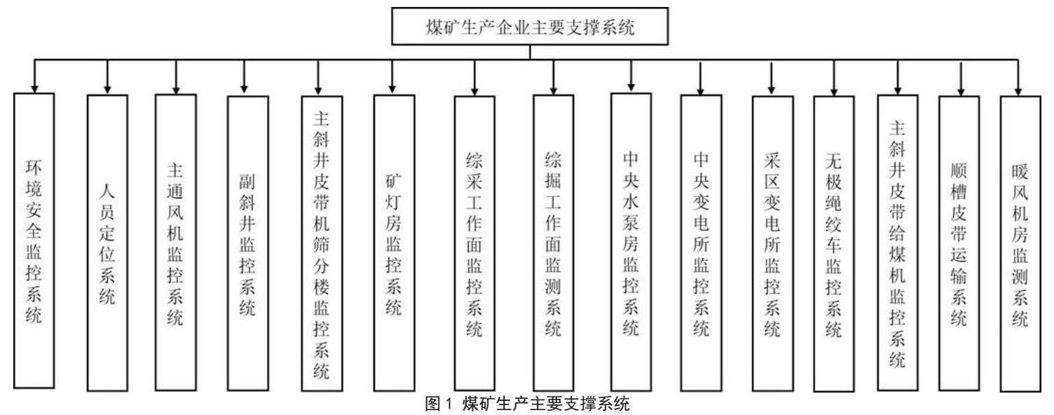 首先,煤矿生产较为繁杂,各体系中含有多个子系统。一般来说,煤矿生产企业大多由这几个主要的系统支撑:环境安全监控系统、主通风机监控系统、主副斜井监控系统、中央变电所监控系统、井下水泵监控系统、皮带运输系统等多个子系统,,如图1所示。各子系统之间绝不是孤立存在的,而是紧密相关的,而连接他们的桥梁就是数据共享,以避免企业各系统变为独立的信息孤岛。通过信息化网络建设,对各类信息进行高效化的处理与整合,使各子系统之间可以紧密配合、协同作业。因此,对于煤矿企业来说,信息化网络建设是促进企业内部互联互通的重要条件。